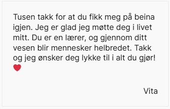 Det varierer fra person til person. Noen får mye ut av én behandling, mens andre har større ubalanser som krever flere runder. Du får alltid ærlig tilbakemelding etter første time.